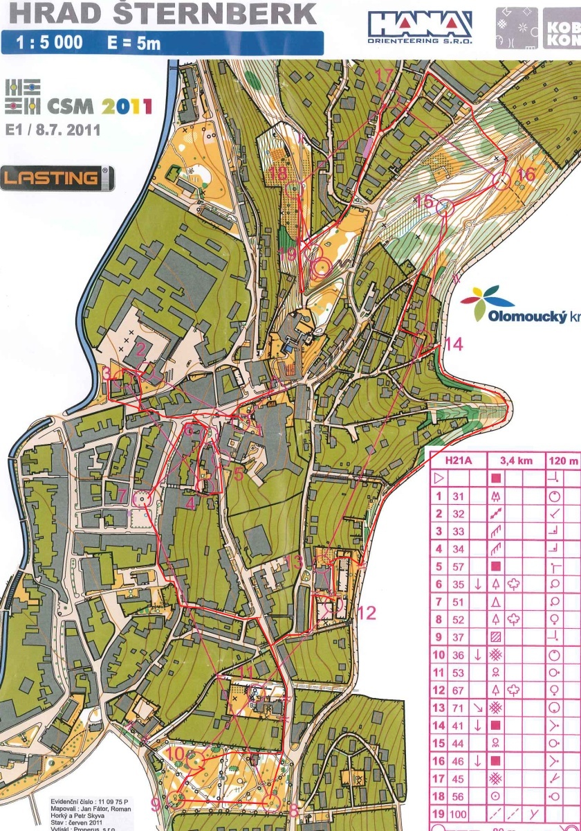 Po náročné Advantě jsme si dali jeden den oraz a v pátek jsme pak pokračovali na dalších závodech, které se konaly téměř za domácími humny. Tříetapová Cena Střední Moravy měla letos centrum ve Šternberku a hned na úvod nás čekal sprint v tomto kopcovatém městě. Start byl sice atraktivně umístěn do místního hradu, ale samotná trať mi už tak moc atraktivní nepřišla. Možná to bylo tím, že se mě v odpoledním dusném počasí běželo dost bídně. Hned na jedničku jsem minul boční schody (které v hůře čitelné mapě stejně vidět nebyly), pak jsme si dali dvě kontroly u místních snědých domorodců a následovala krátká smyčka v centru. Tím se možnosti centra asi vyčerpaly (proč?) a šlo se do parku. V mém případě téměř doslova, ale nahoru jsem to ještě nějak vyběh. V parku opět nic zajímavého, takže to vezmem zase do kopce. Na čtrnáctku přichází první (a bohužel zároveň poslední) volba postupu, která se dost podobá té v Letohradě. Opět je na výběr spodem nebo vrchem a i tady volím horní variantu a tentokrát to snad ani horší postup nebyl. Smysl kontrol 15. a 16. mi zůstává zahalen tajemstvím, takže nám kromě sběrky zbývají už jen dvě kontroly.